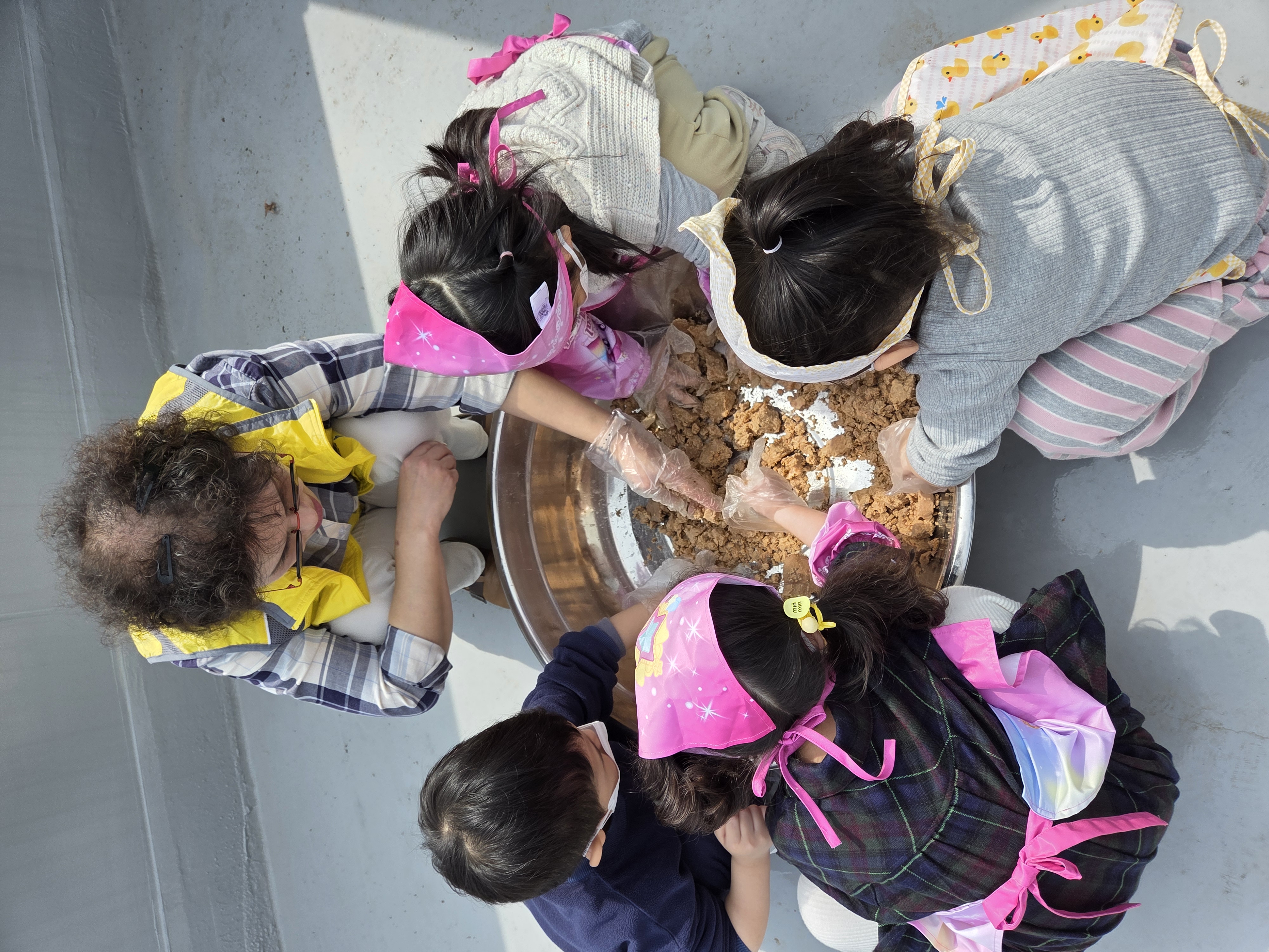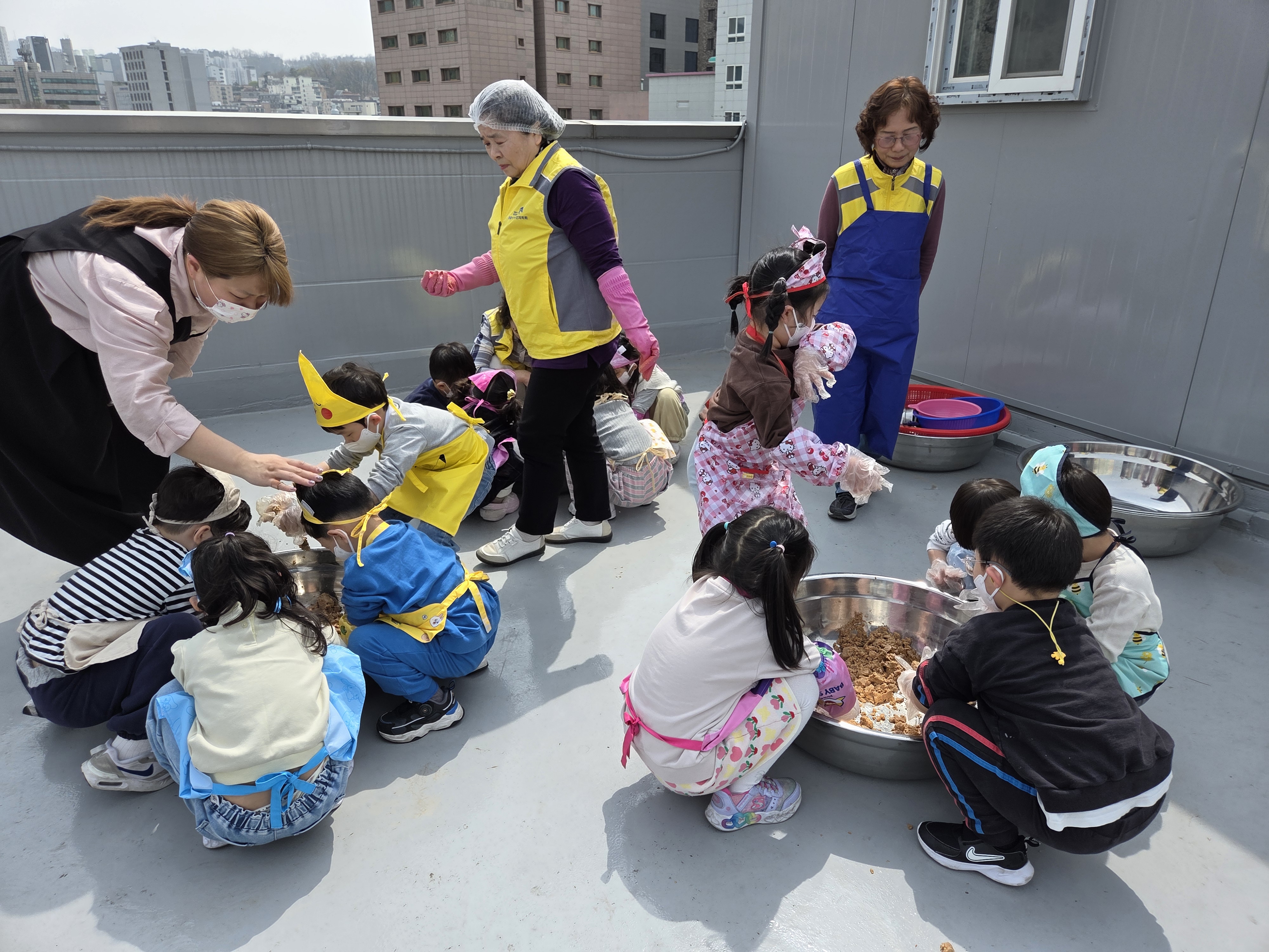 어린이집 2곳에서 20명이 된장 조물 조물 하며 으깨는 모습이 매우 귀엽고 기특했습니다.