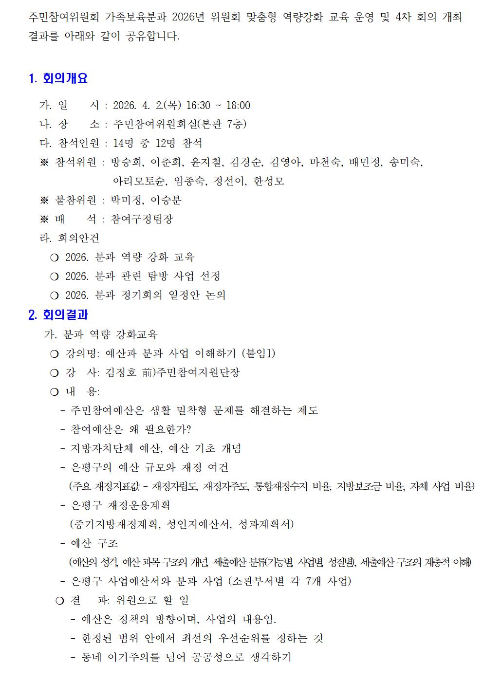 가족보육분과 2026년 4차 회의 개최 결과