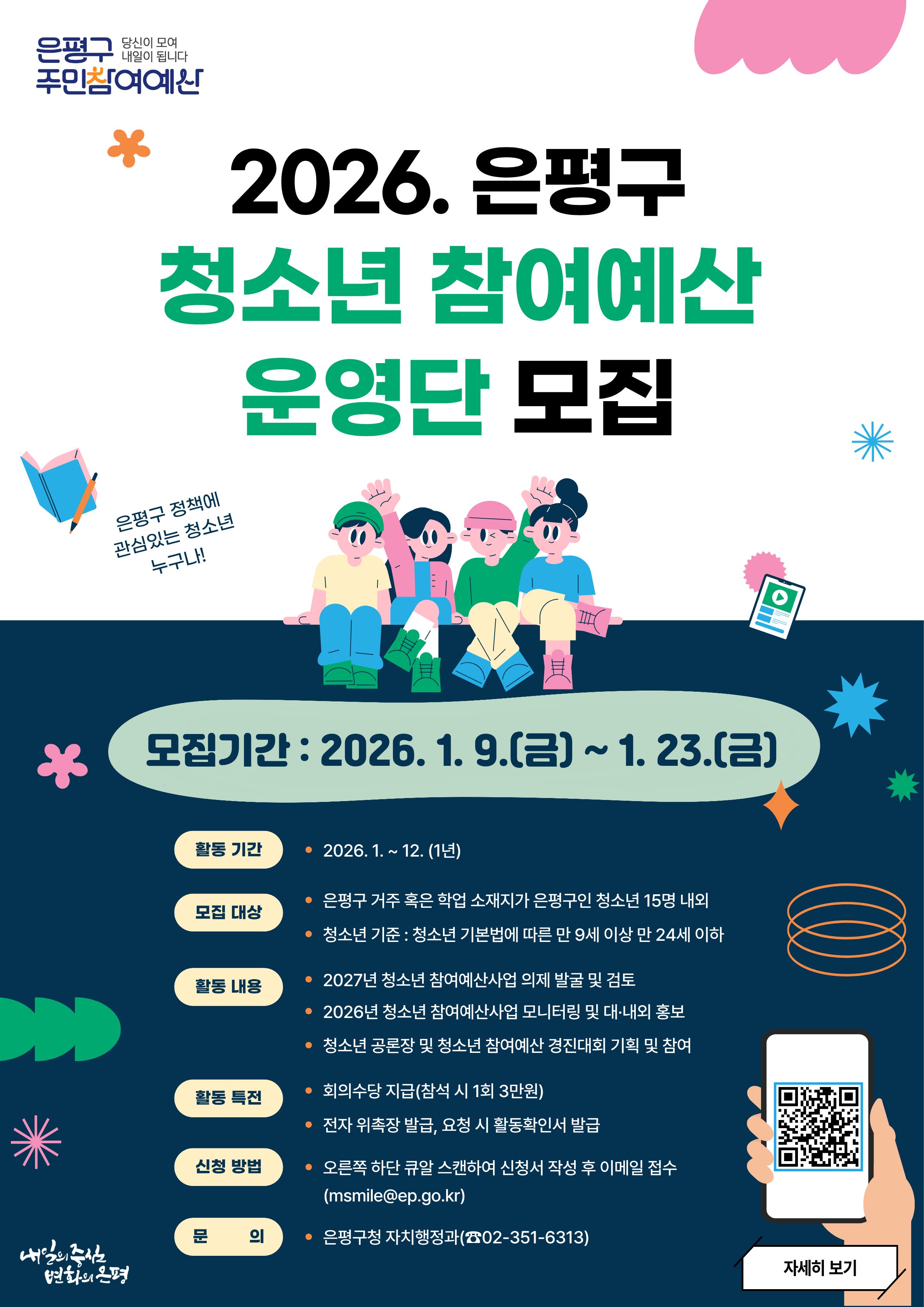 붙임과 같이 ‘2026년 은평구 청소년 참여예산 운영단’을 모집 중에 있습니다.
