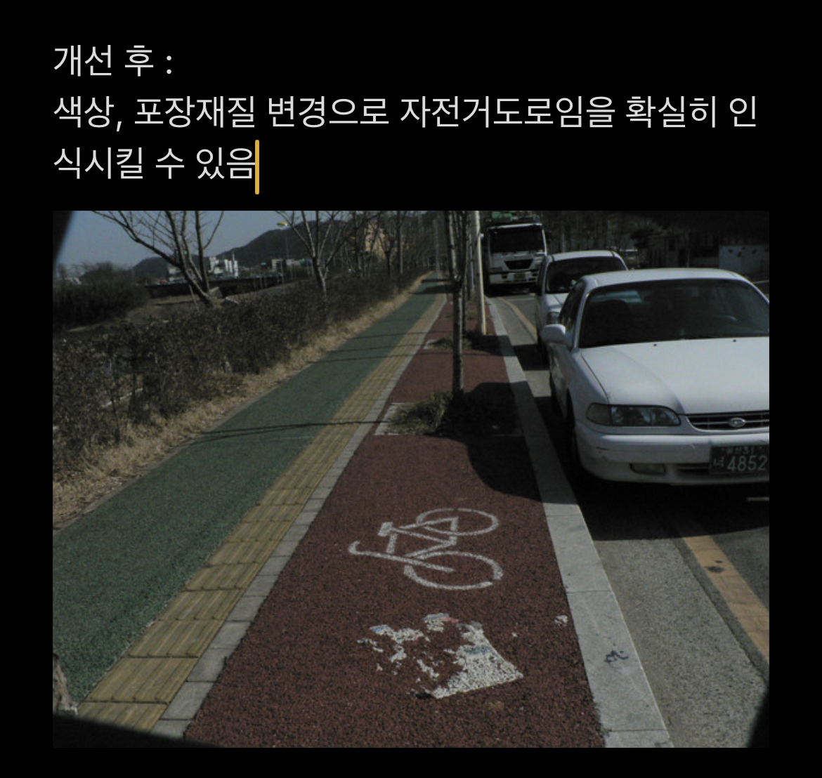 혹은 보도 위 자전거도로를 유지할 경우 인도와 분명히 구분될 수 있도록 포장재질과 색상 변경을 요청합니다.