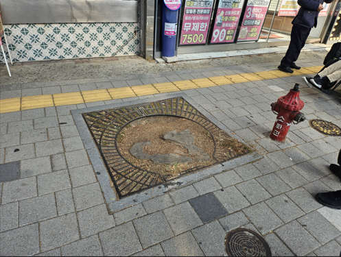 가로수 밑동, 소화전이 보행로 중간에 위치 |