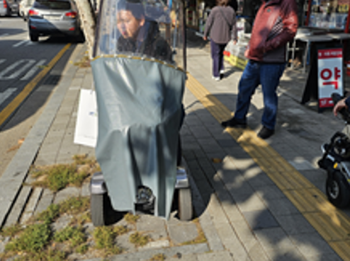 주로 차량이 다니는 길이나, 주차를 하고 나서 전동보장구를 이용해서 밖으로 나올 수 있음, 단차가 3cm 수준으로 불편한 수준임