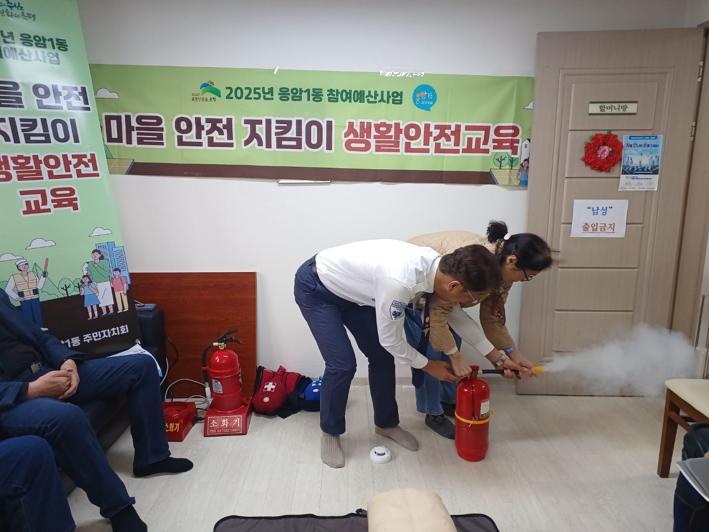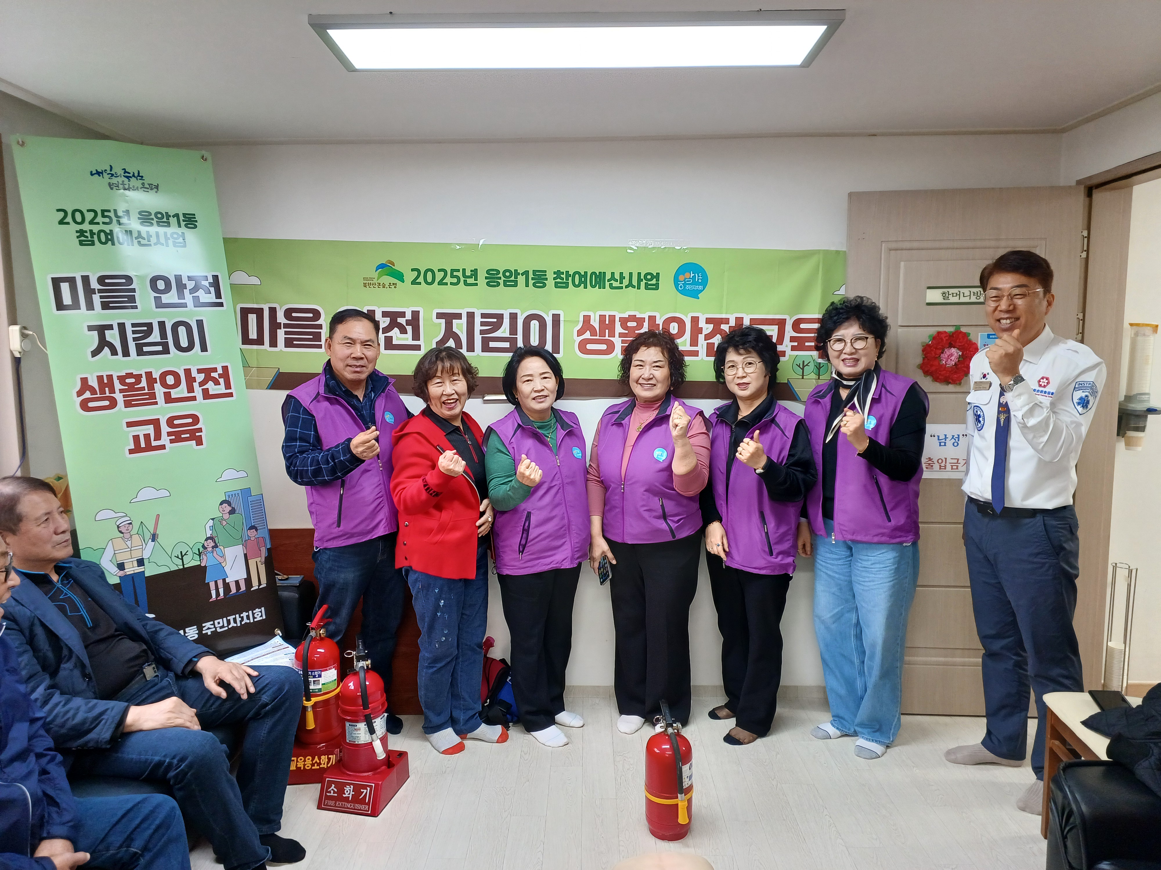 2025년 주민참여예산 사업 마을 안전 지킴이 교육이 2025년 10월 20일 응암 SH-VILLE 아파트 경로당에서 주민들을 모시고 소화기 사용법, 응급조치법을 배우고 실습하는 시간을 가졌습니다.