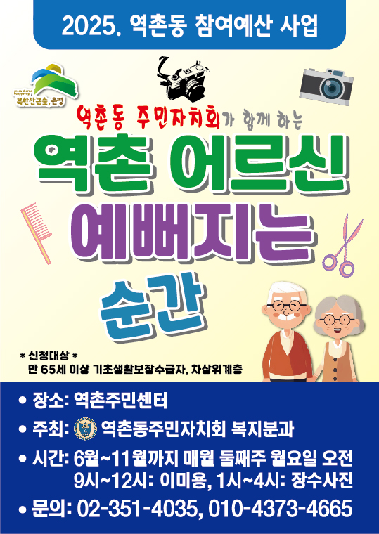 역촌동주민자치회 참여예산 사업 '역촌 어르신 예뻐지는 순간' 수혜자를 아래와 같이 모집합니다.