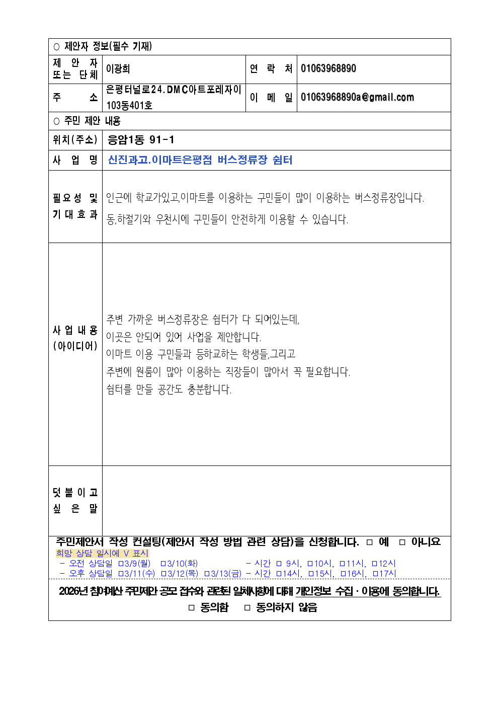 주변 가까운 버스정류장은 쉼터가 다 되어있는데,이곳은 안되어 있어 사업을 제안합니다.이마트를 이용하는 구인들과 등하교하는 학생들,그리고 주변에 원룸이 많아 이용하는 직장인들이 많아서 꼭 필요합니다. 쉼터를 만들 공간도 충분합니다.