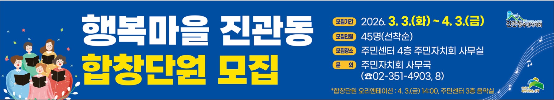 * 합창단원 오리엔테이션 : 2026. 4. 3.(금) 14:00 주민센터 3층 음악교실