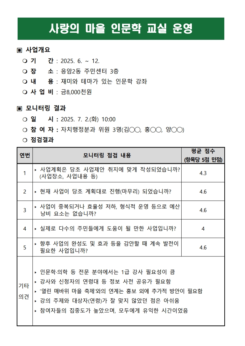 [2025 모니터링 1차 결과보고서] ⑥ 사랑의 마을 인문학 교실 운영