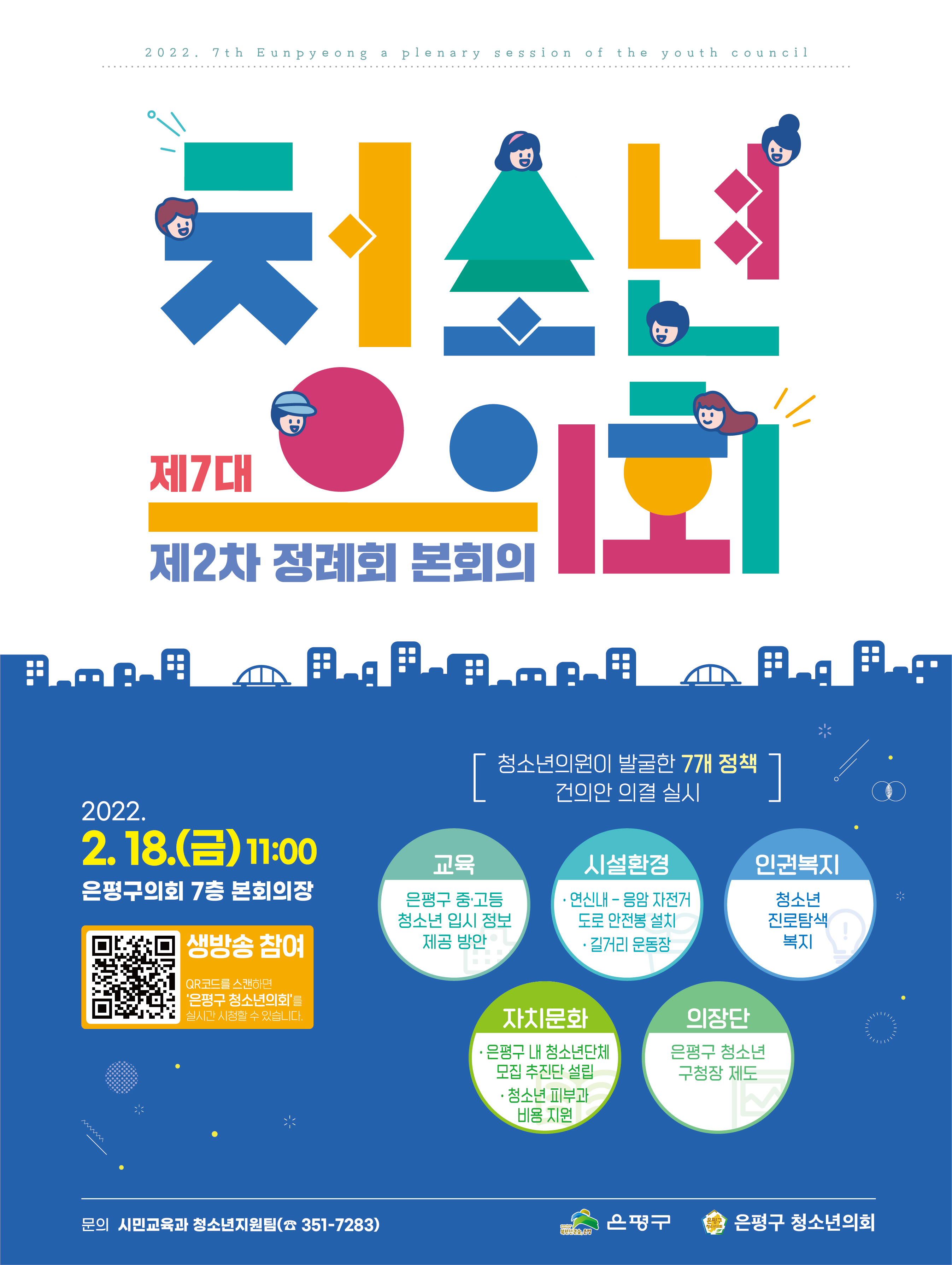 청소년 참여 및 자치권을 확대하고 청소년 정책 제안의 실효성을 높이기 위해 운영하는 제7대 은평구 청소년의회에서 「제2차 정례회 본회의」를 개최할 예정입니다.