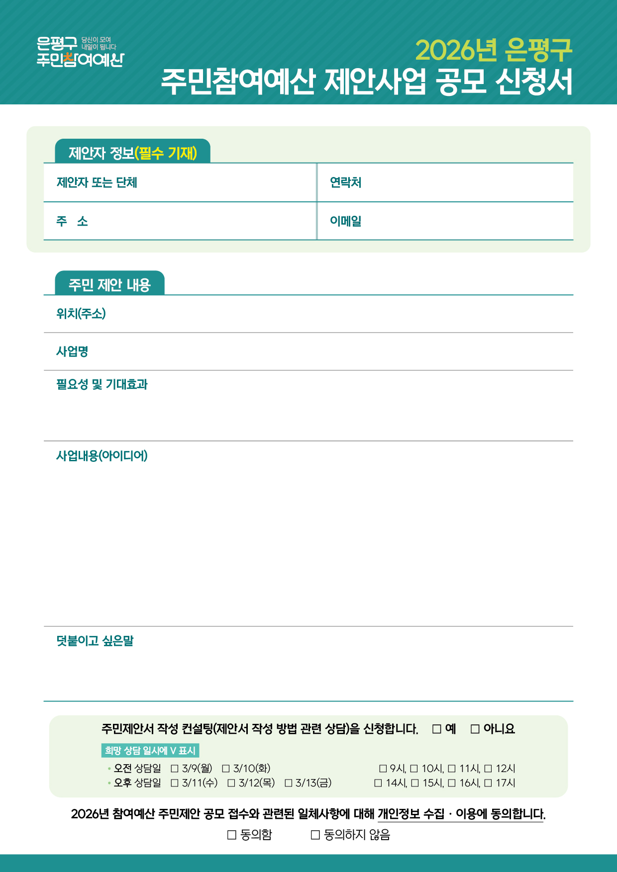 은평구에 필요하고 해결해야될 사업이 선정되고 실행될 수 있도록, 다양한 분야의 참신한 제안을 기다리고 있으니