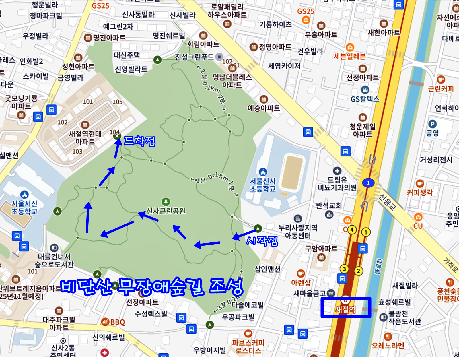 무장애숲길 시작점은 비단산입구에서부터 도착점은 새절역현대아파트 후문까지 입니다