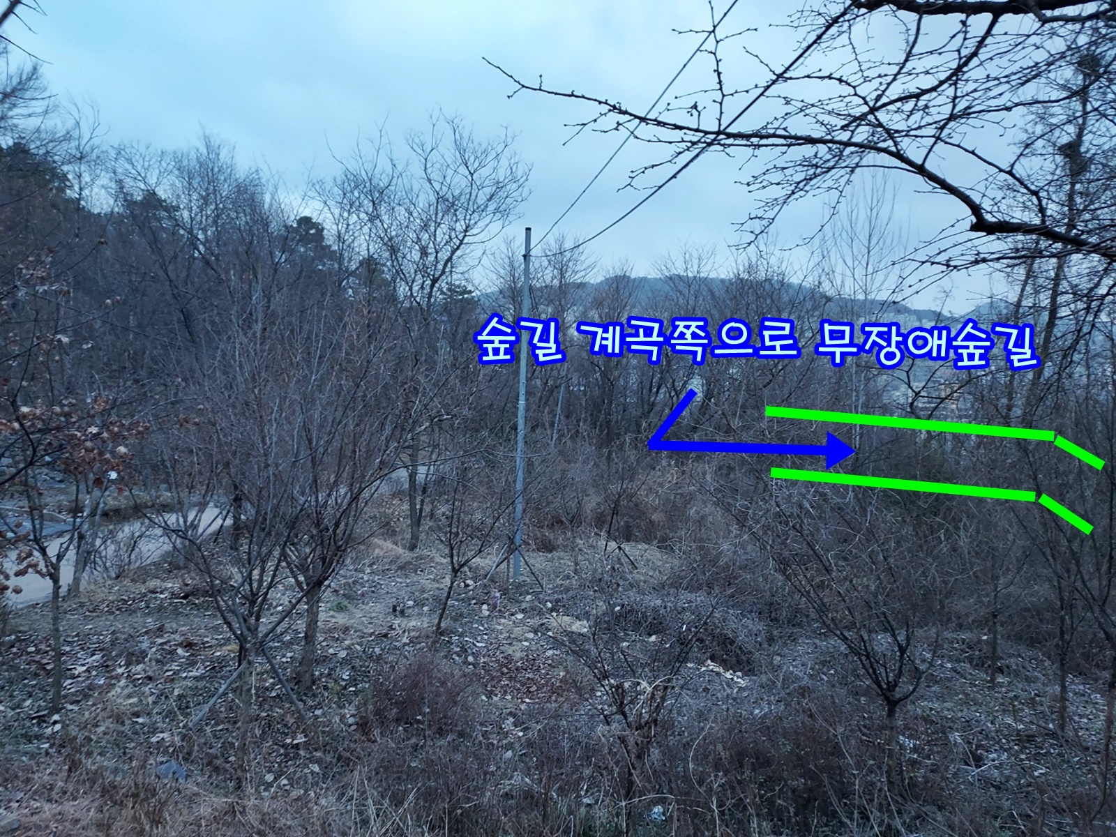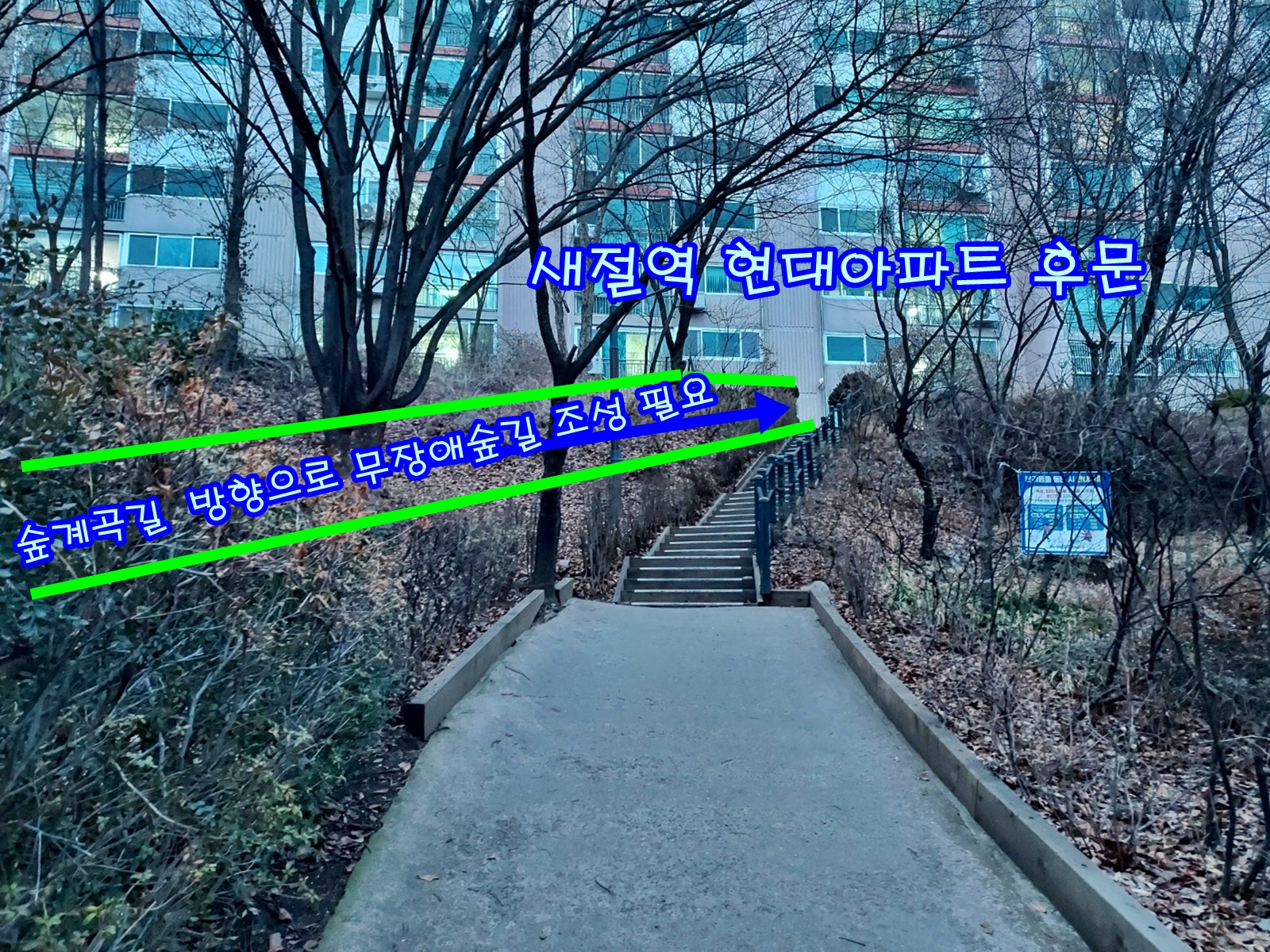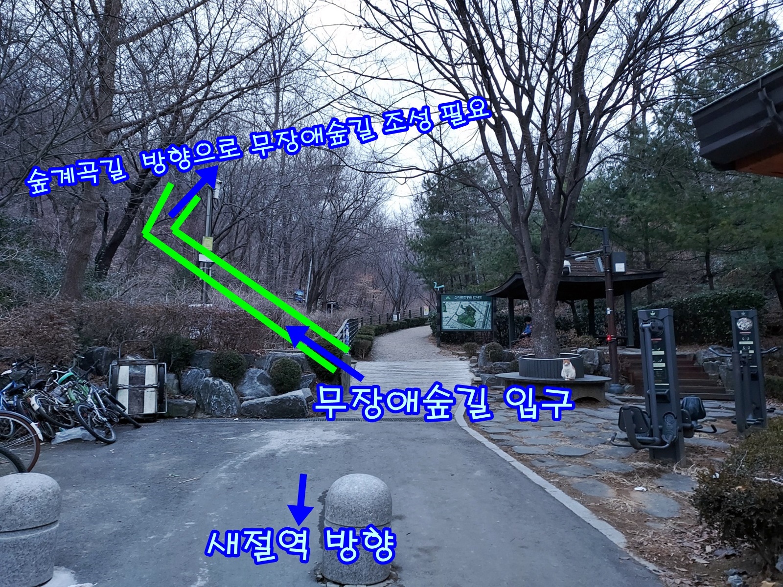 파일첨부 사진에서와 같이 산 계곡쪽으로 계단이 없는 짧은 무장애숲길을 조성해 주셨으면 합니다