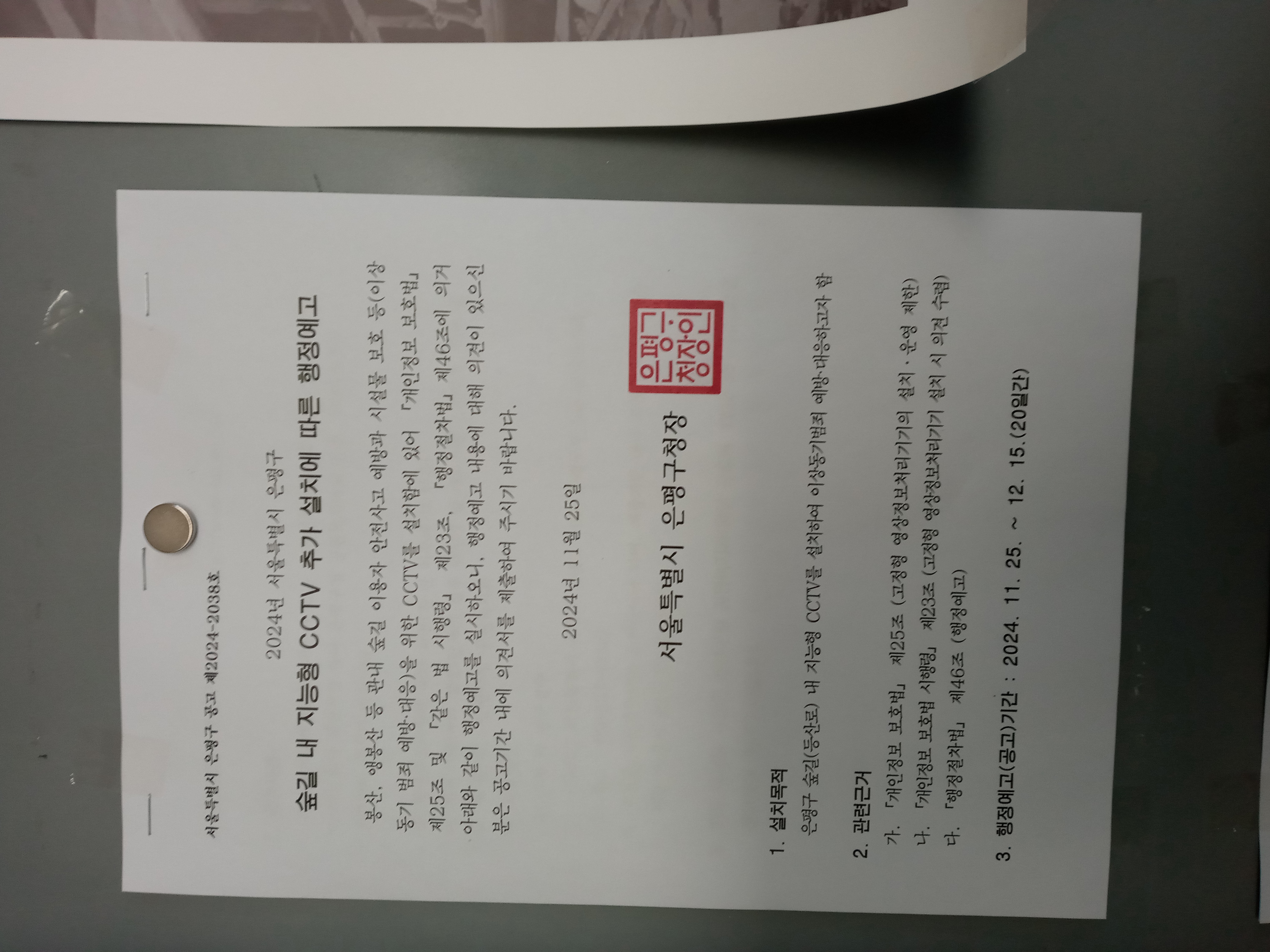 숲길에 cctv를 설치한다고하여 반가운 마음에 의견 올립니다. 요즘 향림에서 사회공헌 활동을 하는데 놀이터 입구 정자 근처 오른쪽 울타리 너머로 무단 폐기된 맥주병 등을 수거하여 쓰레기 폐기 장소에 폐기일자이고 재활용품이라 폐기하였다가 cctv 로 적발되어 무단 폐기로 구청에서 주의 받은 적이 있습니다. 재발 방지 차원에서 숲 ccvt로 안전관리 뿐 아니라 비양심적인 숲 놀이터 무단폐기도 방지하는데 활용되었으면 좋겠습니다. 숲 cctv 무조건 적극 찬성합니다!